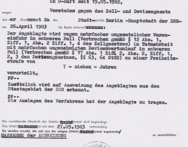 „in Tatmehrheit mit mehrfachem ungenehmigten Devisenwertumlauf in einem schweren Fall“ handelt es sich um Geld das aus dem Verkauf stammt, dass in Form der DDR Mark über die Grenze nach Westberlin gebracht wurde ( durch Diplomaten) bzw. der Tausch mit DDR Bürgern ( das war ein Zollvergehen ) und obwohl Geldumtausch von Mark der DDR in DM unter Kollegen ( Devisenausländern ) – wofür es bei der Verurteilung KEINEN Paragraphen im Devisen Gesetz gegeben hatte(!?) wurde ich trotzdem deswegen verurteilt – auch ohne Gesetz. Kurzum, Historiker Helmut Müller Enbergs ( Verfassungsschützer ) in der Gauck Behörde erkannte bei der Durchsicht meiner STASI-Akte sofort, dass es sich um einen klassischen Fall von KURIERFAHRTEN handelte.